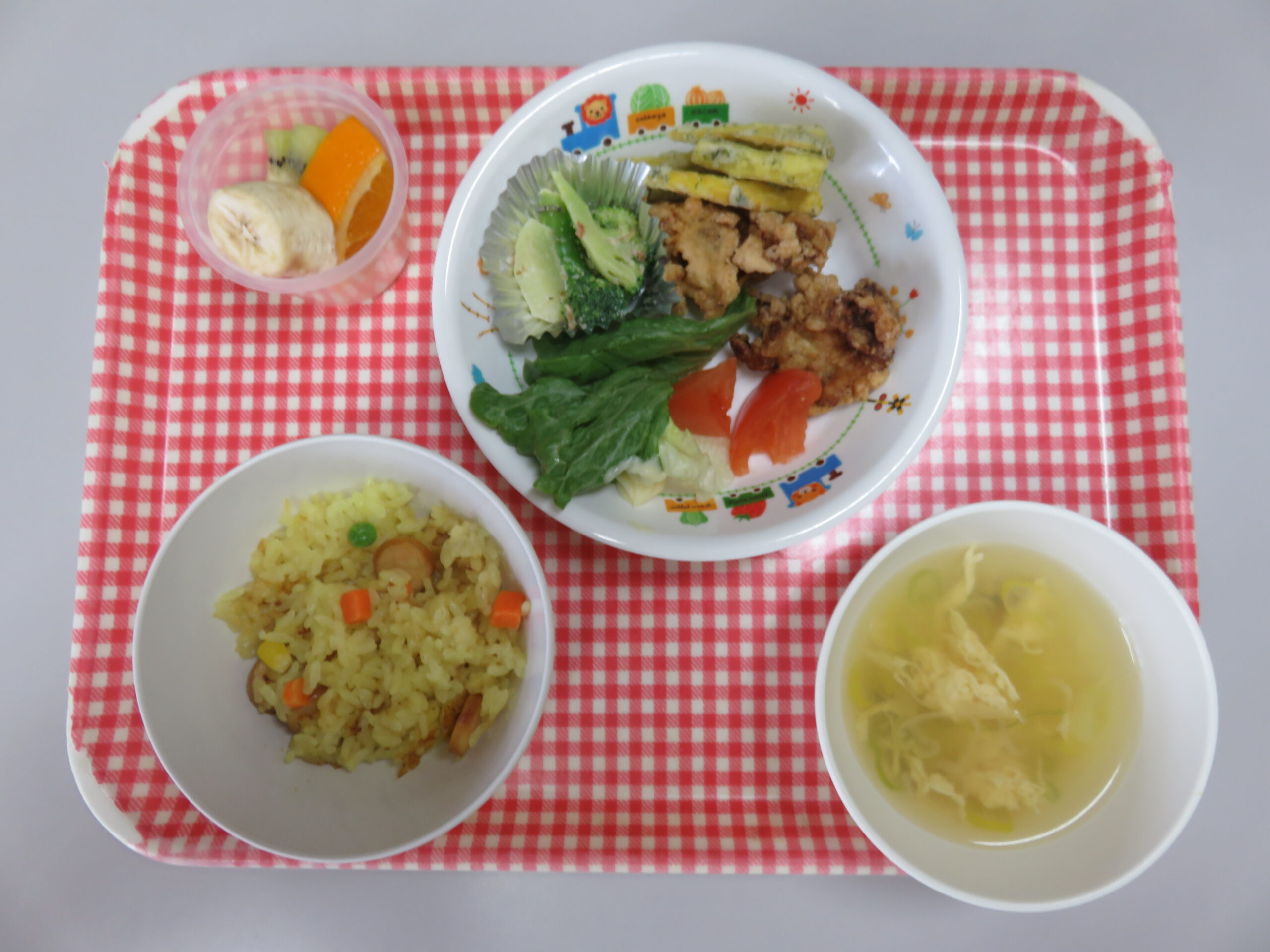 ブロッコリーのごまマヨ和え、卵スープ、フルーツの盛り合わせ でした!