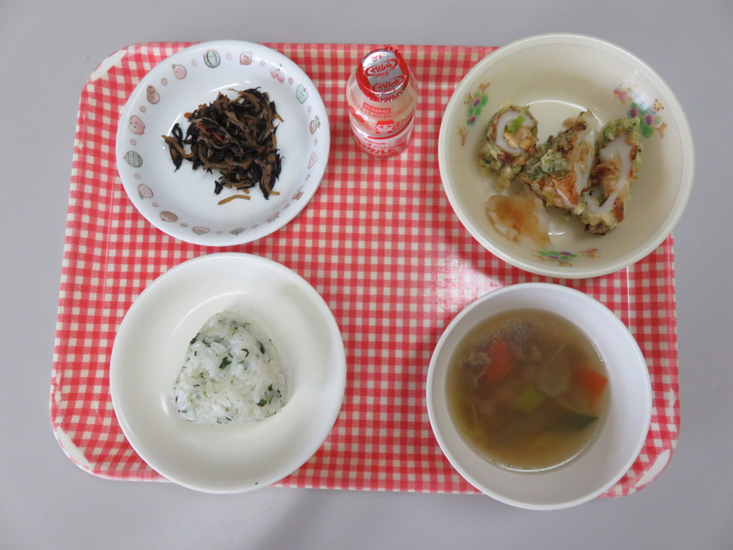 豚肉と根菜のポカポカスープ、ヤクルト(ひよこ組:ヨーグルト) でした。