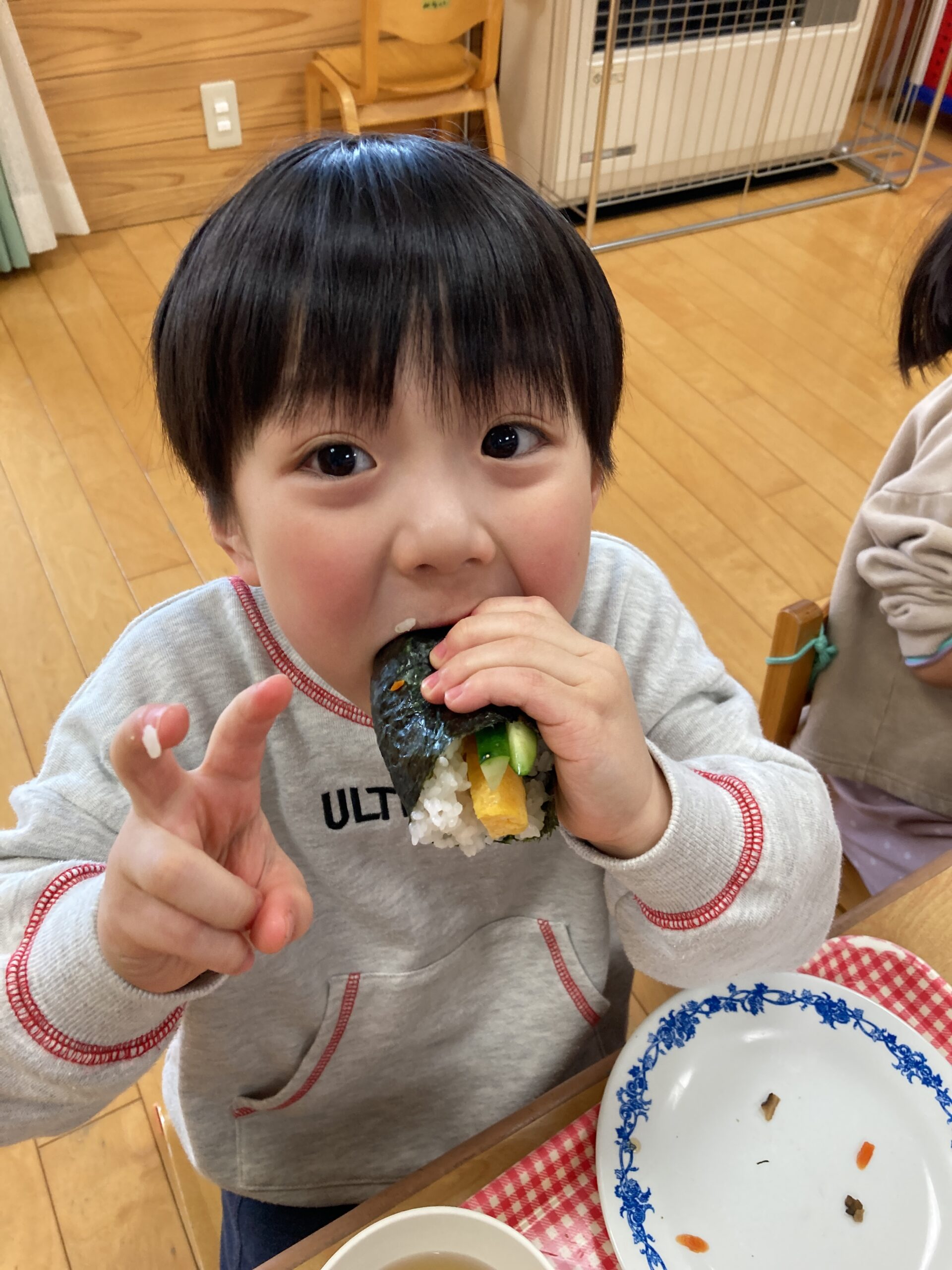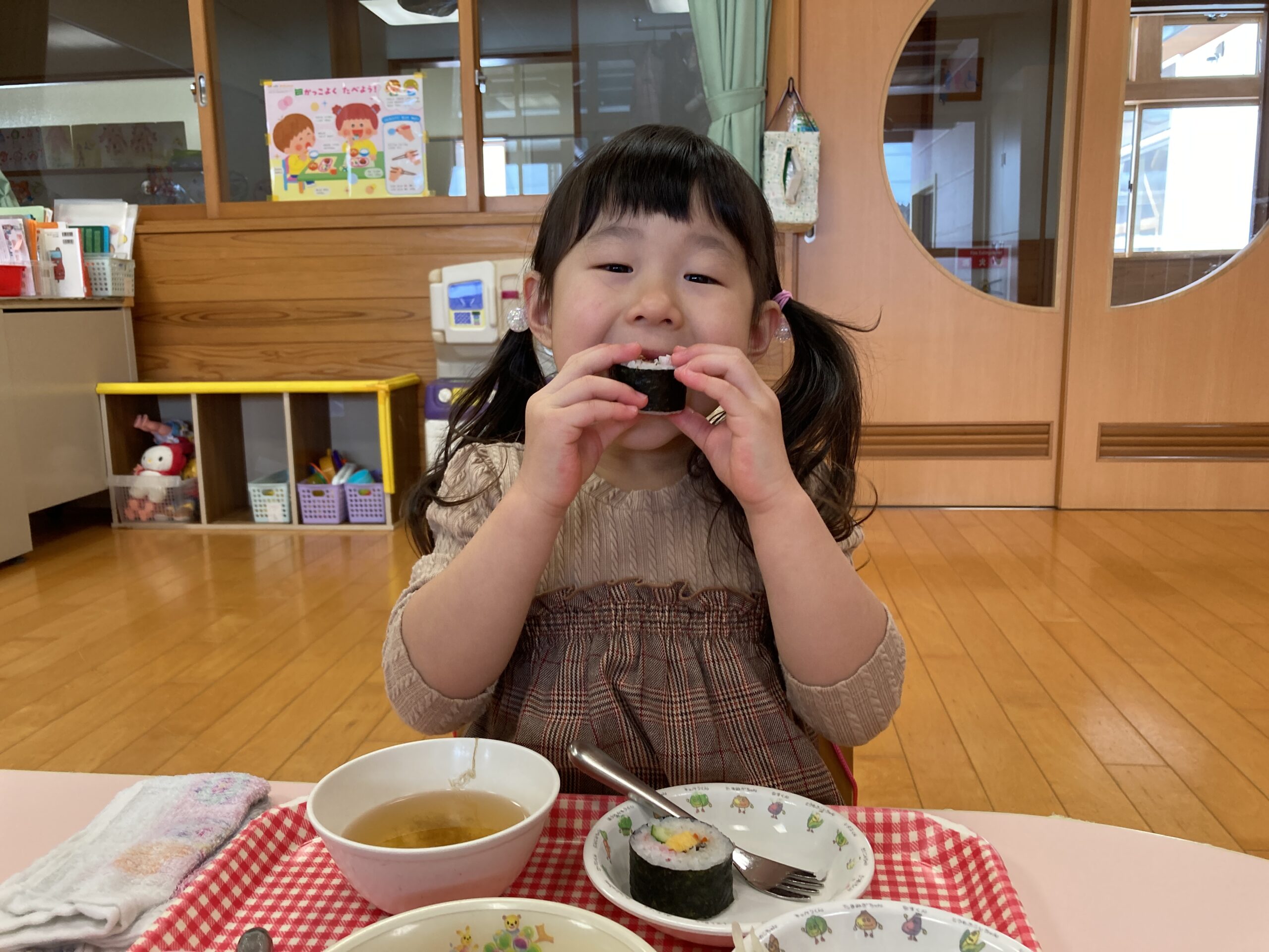 (きりん組:セルフ恵方巻、こあら組:恵方巻、ひよこ組:ちらし丼)