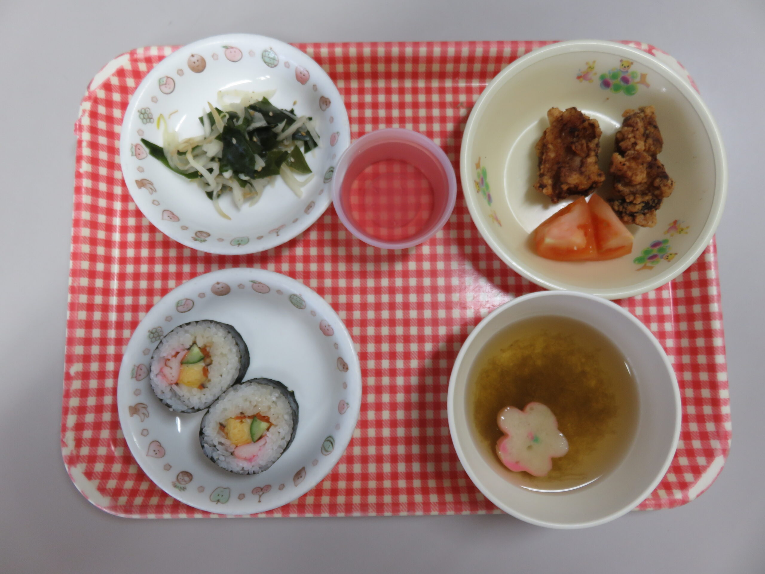 メニューは・・・ セルフ恵方巻、鶏肉の塩麴唐揚げ、トマト、